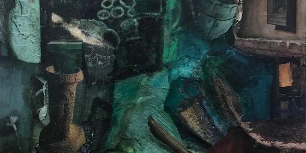 The artist's work is richly textured and highly tactile with many layers of paper, ink, and paint
